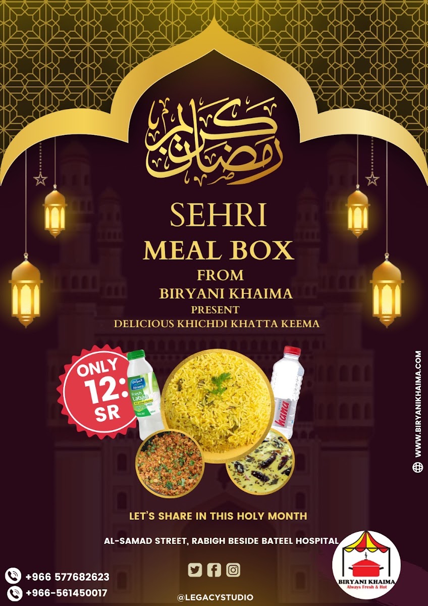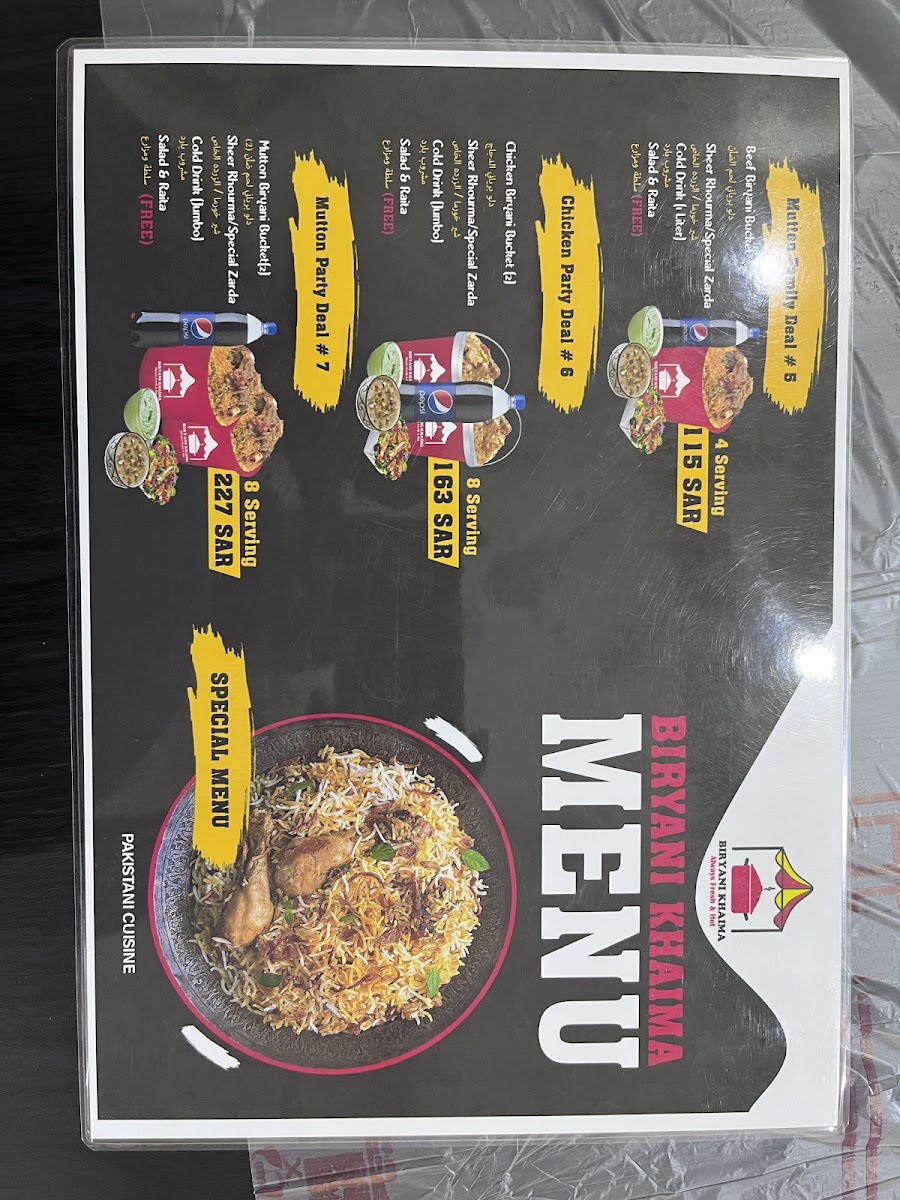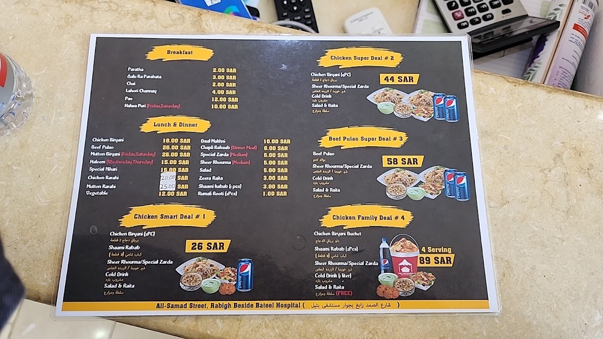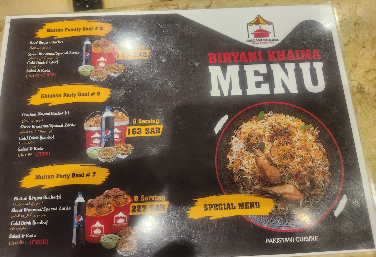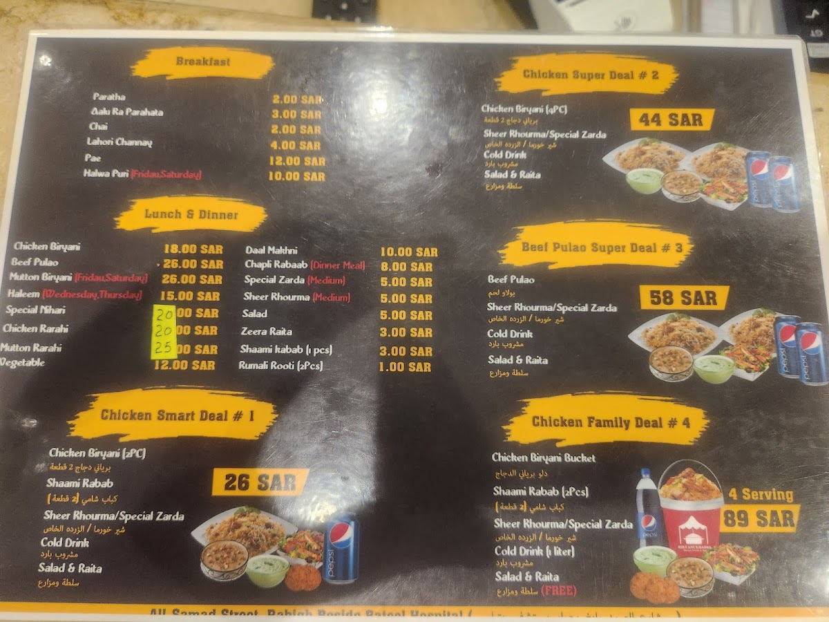 At Biryani Khaima بريانى خيمة on King Abdullah Street, Marjania, Rabigh 25724, the menu feels focused and comforting-built around familiar South Asian flavors with a few sweet finishes and simple drinks to round things out. For something light in the morning, breakfast staples like Paratha Bread, Tea With Milk, and Fried Egg keep it classic, while heartier options such as Beef Paya and Balilah Lahori add a traditional, slow-cooked touch. The main dishes are clearly the highlight: Mutton Biryani anchors the selection, supported by rich sides like Daal Makhani, and savory curries including Daytime Beef, Chicken Achari Karahi, and Green Chicken-a lineup that suggests bold spices and satisfying portions. To cool down, the beverage choices are straightforward and practical: Citrus Mirinda, 7up, Water, Diet Pepsi, and Pepsi 1 Liter. And if you want a sweet ending, desserts like Kheer Mix, Zarda Rice, and Sweet Carrot neatly complete the experience with traditional dessert flavors rather than anything overly complicated.